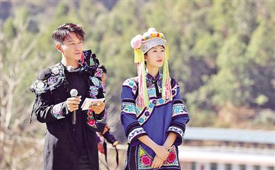 东方卫视的扶贫节目《我们在行动》(第三季)中,童谣、李宗翰身穿彝绣服饰为推介会助力。资料图片