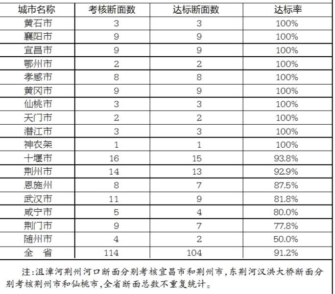 全省114个地表水考核断面中达到水质目标要求的断面104个,占91.2%;水质符合Ⅰ~Ⅲ类的断面98个,占86.0%;水质为劣Ⅴ类的断面2个,占1.8%。黄石市等10个城市水环境质量目标完成情况较好,考核断面达标率100%;随州市水环境质量目标完成情况较差。斧头湖江夏湖心等断面(点位)未达到国家考核目标要求。(各地断面的具体名称、水质目标、达标时限和水质情况详见湖北省生态环境厅门户网站 sthjt.hubei.gov.cn)