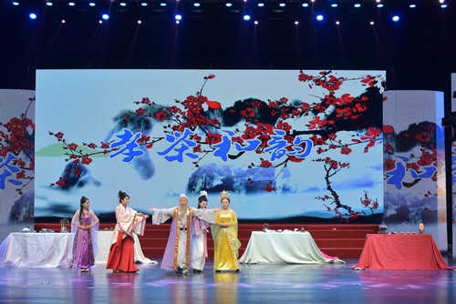 茶艺竞赛第一名官莉娟、第二名王乔乔等4名茶艺师,结合老莱娱亲的故事,精心选取荆门四大名泉冲泡孝茶,供奉双亲,用匠心传递孝心,表演了一场孝老爱亲、知礼懂礼的《孝茶和韵》节目。