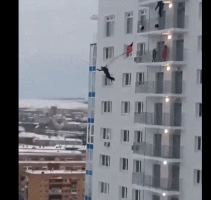 根据俄媒发布的视频,两名男子站在一幢可以俯瞰叶尼塞河的高层建筑里,从24层的阳台栏杆上俯身跳下。