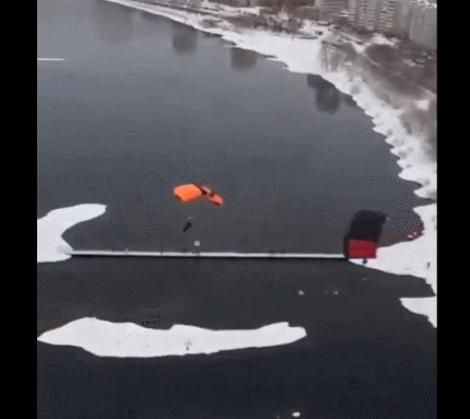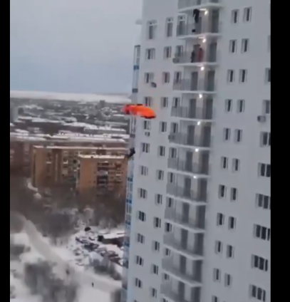 海外网1月3日电 “今日俄罗斯”消息称,在俄罗斯西伯利亚城市克拉斯诺亚尔斯克,两名特技挑战者似乎对新年派对感到厌倦,于是他们决定从公寓楼跳伞离开。