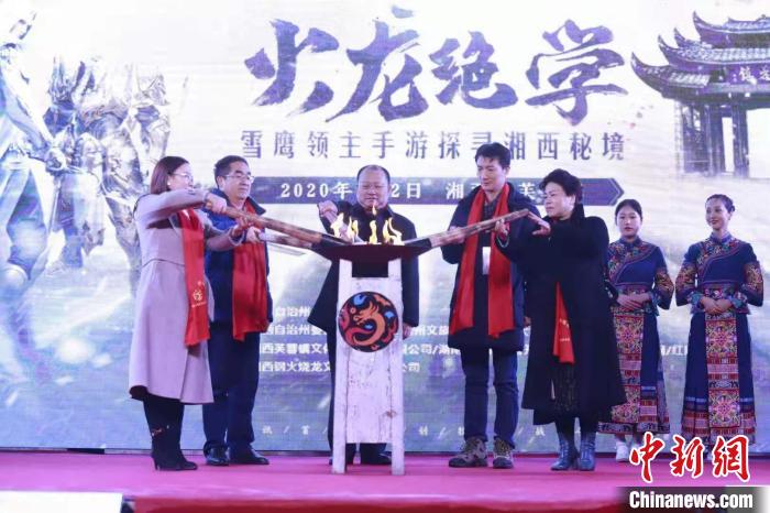 《雪鹰领主》手游携手湘西非遗技艺“钢火烧龙”2日晚在湘西芙蓉镇红石林景区举行了“火龙绝学探寻湘西秘境”湘西非遗文化守护宣言发布仪式。
