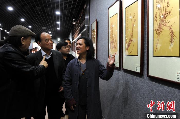 大可(右一)向嘉宾介绍他的艺术作品。 张金川 摄