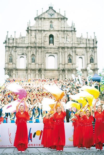 演员在澳门大三巴牌坊前进行澳门国际青年舞蹈节巡游表演。