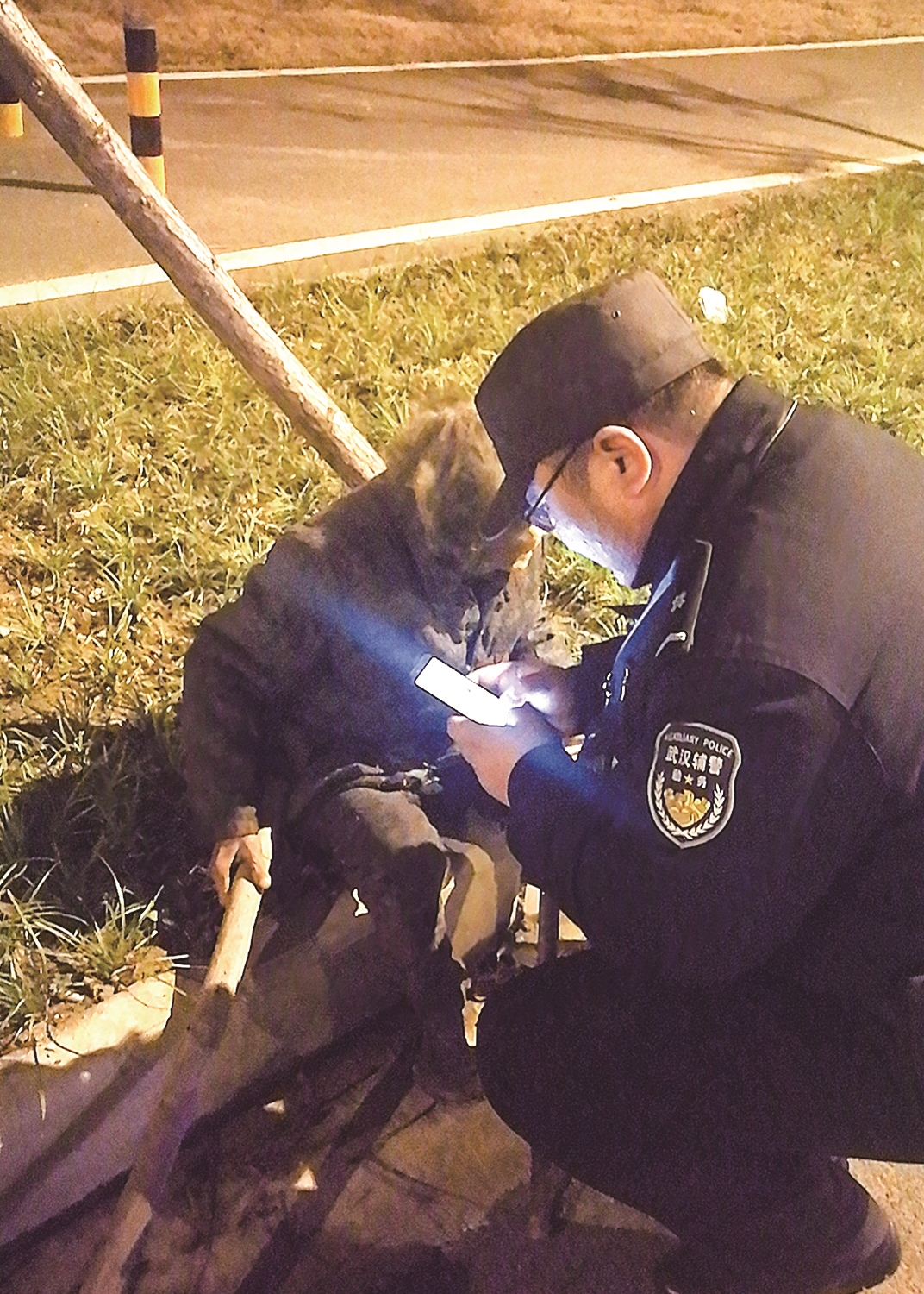 黄土公路连接黄陂和大悟。该路拓宽后,以前住在道路两旁的农户大多搬走,平时难见行人,只有来往不断的车辆。尤其是入冬后的夜晚,这条路上更加冷清。2日,黄陂区公安分局罗汉派出所民警袁权等三人,到辖区内的研子社区开展节前“保稳定、守平安、创满意”专项行动清查,晚8时许驾车踏上返程。他们行至黄土公路白塘村路段时,发现前方车辆纷纷变道。民警们仔细一看,只见疾驰的车流里,有人蹒跚逆行,情况十分危险。