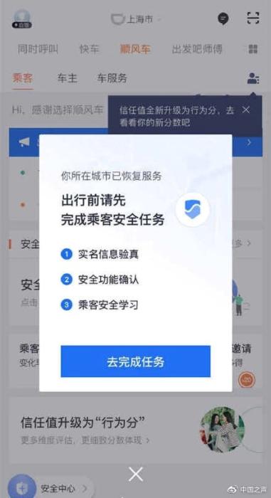 作为乘客,首次使用滴滴顺风车需要完成“实名信息认证”“安全功能确认”“乘客安全知识学习”三个任务。其中,乘客上车时会收到信息核验卡问“这个人是不是这个人,这个车是不是这个车”;在行程中,滴滴顺风车还会提示打开设置紧急联系人、开启录音功能等等。