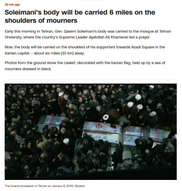 据CNN描述,苏莱曼尼的棺木被伊朗国旗覆盖,由一群身穿黑衣的悼念者抬着。报道称,在苏莱曼尼棺木被运至阿扎迪广场途中,德黑兰的街头挤满了前来吊唁的人。此外,CNN还补充说,今天稍晚时候,他的遗体将在伊朗圣城库姆的一处圣地停放几小时,随后埋葬在苏莱曼尼的家乡科尔曼市。