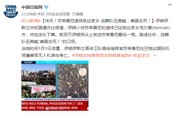 【快讯!苏莱曼尼遗体抵达家乡 送葬队伍高喊:美国去死!】伊朗伊斯兰共和国通讯社报道,伊朗少将苏莱曼尼的遗体已经抵达家乡克尔曼(Kerman)市,将在该处下葬。数百万伊朗民众上街送苏莱曼尼最后一程。路透社称,送葬队伍高喊“美国去死!”的口号。