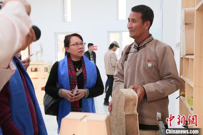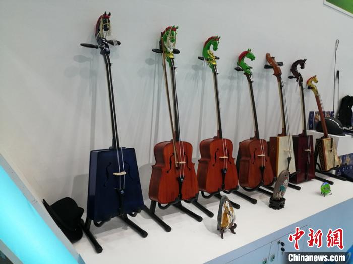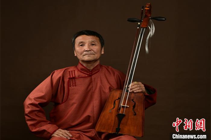 图为乌力吉(右)为来访嘉宾介绍马头琴。受访者供图