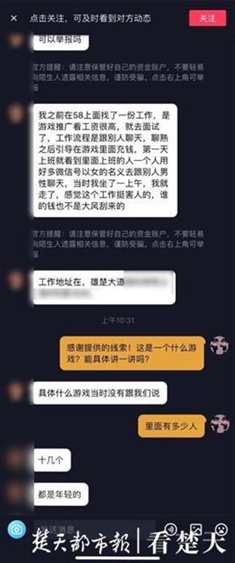 “我之前在网上找了一份工作,是游戏推广,看工资很高就去面试了,工作流程就是跟别人聊天,聊熟之后引导在游戏里面充值。第一天上班,就看到上班的一个人用好多微信号以女性身份去跟别的男性聊天,当时我坐了一上午就走了,我感觉这个工作挺害人的,谁的钱也不是大风刮来的。”举报人提供了窝点的详细地点,并表示“有许多年轻人在里面”。