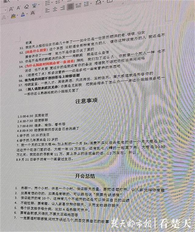 为了达到聊天效果,团伙在“开会总结”中写到,“热聊一两个小时,休息一个小时,保证聊天质量,要让别人觉得你有趣”;“如果有人约你出来,如果是有钱人,就说‘我要先谈感情’”;“保证能开的有10个,即便有几个不能开也可以保证自己的业绩”;“不能尬聊天,要有趣,让人家喜欢和你聊天”;“每个好友按照字母分类,比如A类是热聊可开户”;“要有幽默感,只调侃,不要太正经”;“一定要适时聊感情,问对方谈过几个,然后交换自己的故事”。