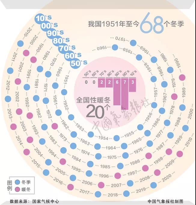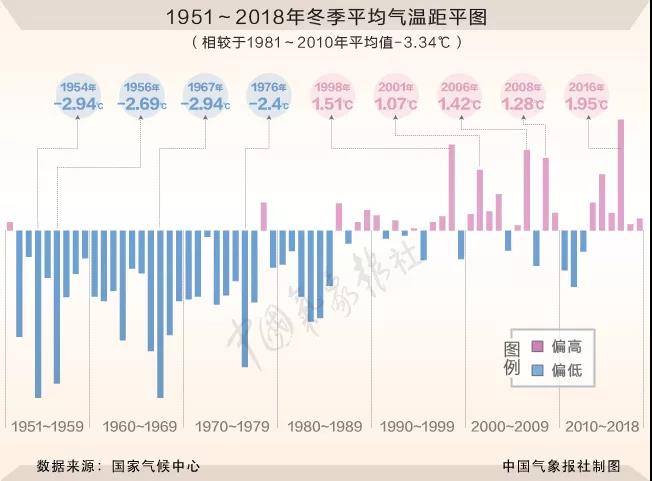 我国从1951年到2018年68个冬季,气温比平均值偏暖的年份一共有25年,而1985年以后偏暖的年份就占了23年。