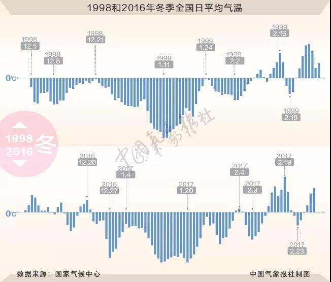 统计数据显示,2016年冬季和1998年冬季是我国有完整观测记录以来最暖的两个冬季,这两个冬季内,全国平均气温在大部分时间都比常年平均值高,但也都有明显的气温波动和气温明显低的阶段。