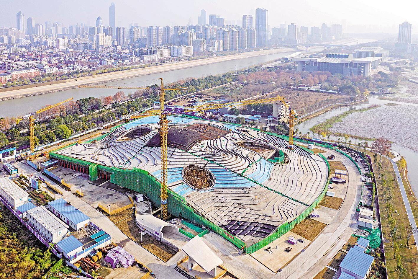 1月8日,琴台美术馆主体结构施工已完成,将进入装饰装修阶段。位于汉阳月湖艺术博览区的琴台美术馆,总建筑面积约4.3万平方米,计划2020年建成。作为国内单体建筑清水混凝土建造比例最大的项目,其空间设计形式多变,时而沿缓坡盘旋而下,时而随长梯扶摇直上,如同走入空间魔方,镶嵌在月湖畔。 (湖北日报全媒记者 梅涛 通讯员 潘海亮 杨洋 摄)