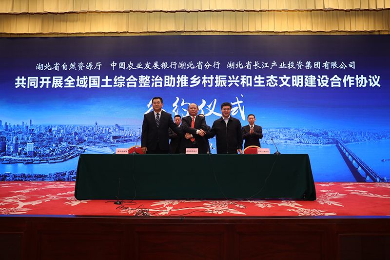 荆楚网客户端—荆楚网消息(记者徐蕾、通讯员唐玥)1月9日,湖北省自然资源厅、中国农业发展银行湖北省分行、湖北省长江产业投资集团有限公司商定建立合作机制,在未来5年时间内向湖北省全域国土综合整治项目提供不低于1000亿元的意向性融资支持,共同推进全域国土综合整治,合作协议在武汉签署。