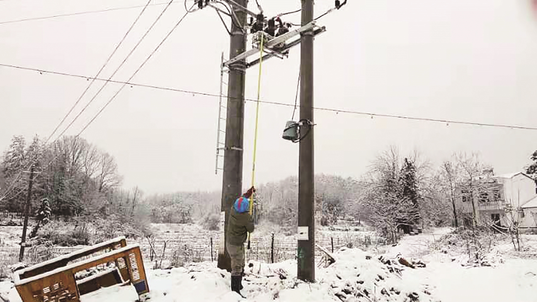昨日上午,楚天都市报记者在武汉北部的黄陂看到,三条高压线受雨雪覆冰影响相继跳闸,黄陂区供电公司组织的抢修人员赶到现场后,在雪地上开展抢修,尽可能缩短停电时间。