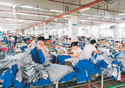 在“霸王爵士”生产车间里,工人们在赶制一批服装。