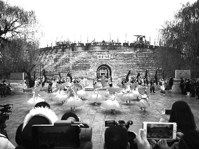 伴随着悠扬的古乐,明故城门缓缓打开,开城仪式歌舞过后,第一批走进孔庙的游客登上钟楼,敲响祈福的钟声,新的一年拉开帷幕。随后,游客纷纷来到孔庙诗礼堂,体验“诗礼传承”,参加手抄《诗经》《礼记》等儒学经典活动。