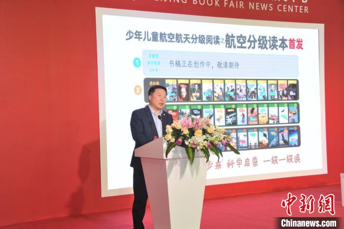 中航出版传媒有限责任公司董事长刘柱介绍国内首套原创少儿航空航天分级读本。主办方供图