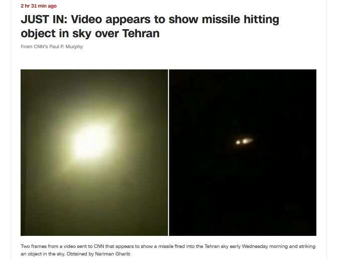 外媒称乌克兰失事客机系被伊朗击落后,美媒发视频:德黑兰上空一目标被导弹击中