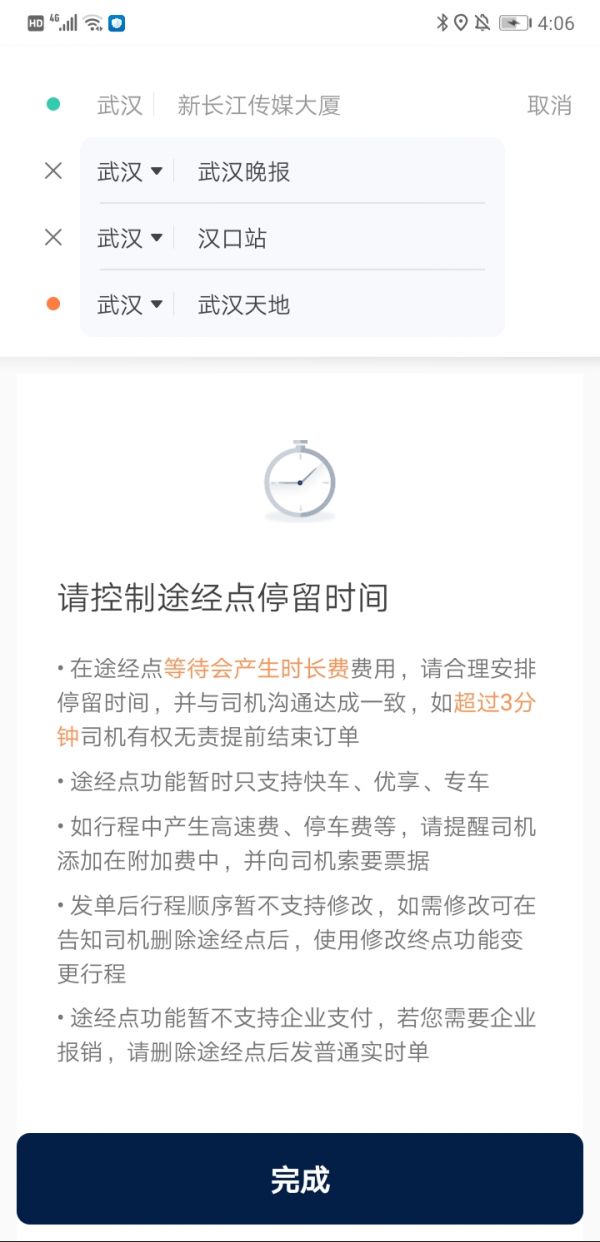 主要注意的是,在乘车后,司机将依序把乘客送达不同的途经点,每个途经点的停留时间不超过3分钟。如乘客需要在某个地点长时等待,则需与司机沟通达成一致,司机有权提前结束订单。行程结束后,乘客可以在“我的订单”查看行程信息、订单中的途经点。