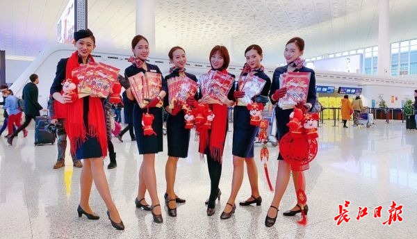 早上,T3航站楼东航售票柜台前载歌载舞、热闹非凡。东航武汉公司联合民航湖北空管分局开展了春运首日快闪活动。随着激情动感的音乐声和歌舞上演,步履匆匆的旅客纷纷驻足。靓丽的空姐们用舞蹈《我们的新时代》礼赞新时代,也表达了对旅客的祝福。