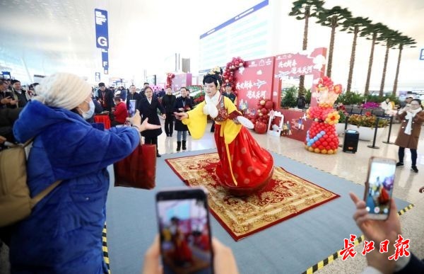 长江网1月10日讯 1月10日春运首日,随着一场别开生面的民俗艺术活动开启,也标志着为期 40天的机场春运正式启幕。春运首日,武汉天河机场预计起降航班591架次,迎送旅客将达8.2万人次。
