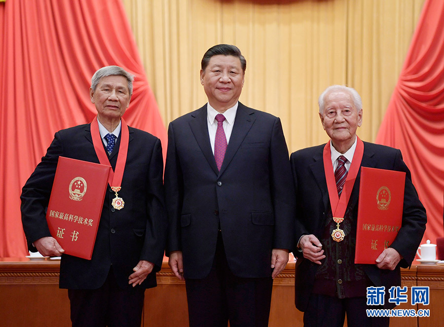 1月10日,2019年度国家科学技术奖励大会在北京人民大会堂隆重举行。中共中央总书记、国家主席、中央军委主席习近平向获得2019年度国家最高科学技术奖的原中国船舶重工集团公司第七一九研究所黄旭华院士(右)和中国科学院大气物理研究所曾庆存院士(左)颁奖。 新华社记者 李学仁 摄