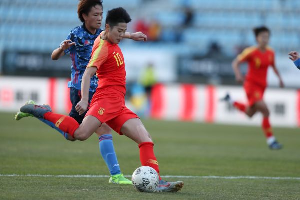 12月14日,中国队球员李影(前)在比赛中射门 中国队对阵日本队 新华社记者 张可任 摄