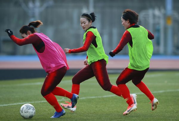 12月9日,中国女足球员吴海燕(中)在训练中,中国女足在韩国釜山训练 新华社发