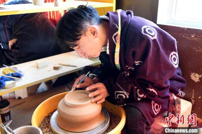 藏族小伙制作藏陶。 安源 摄