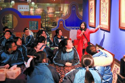 1月11日,湖南省长沙市长郡湘府中学学生来到位于长沙市雨花区的雨花非遗馆滩头高腊梅年画传习所,学习制作国家级非遗项目滩头年画,迎接新春佳节的到来。图为滩头高腊梅年画传习所工作人员戴静为学生讲解滩头年画。薛宇舸 摄