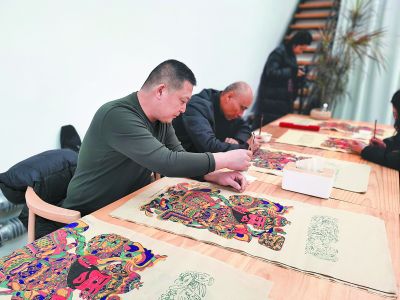 春节临近,河北武强木版年画进入销售旺季,年画作坊内一片忙碌,年画艺人忙着制作、销售年画,保证年画市场的供应量。2006年,武强木版年画入选第一批国家级非遗代表性项目名录。图为1月12日,河北省武强县的一名年画艺人(右)印制武强木版年画。李晓果 摄