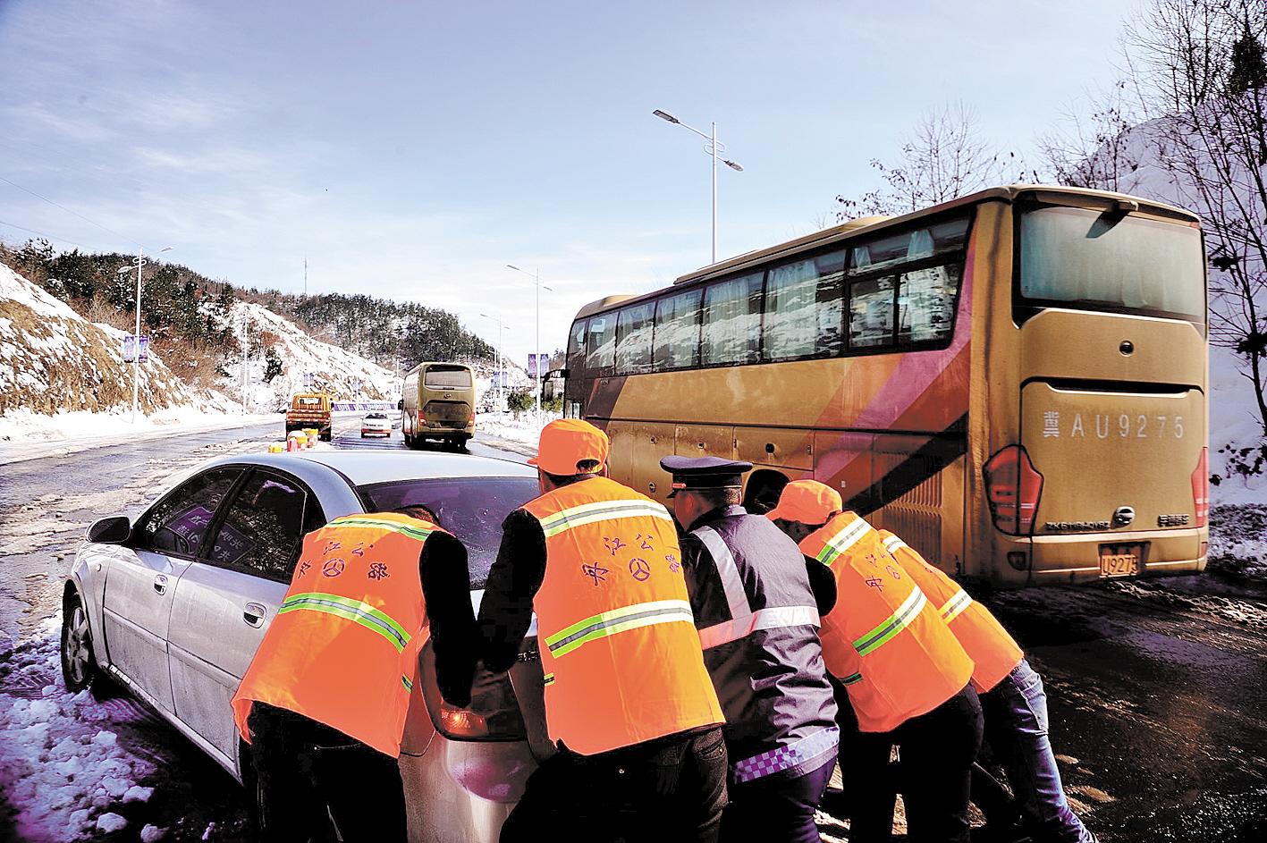 1月11日,丹江口市下起大雪,该市公路职工帮助被困司机推车。(视界网 杨道三 摄)