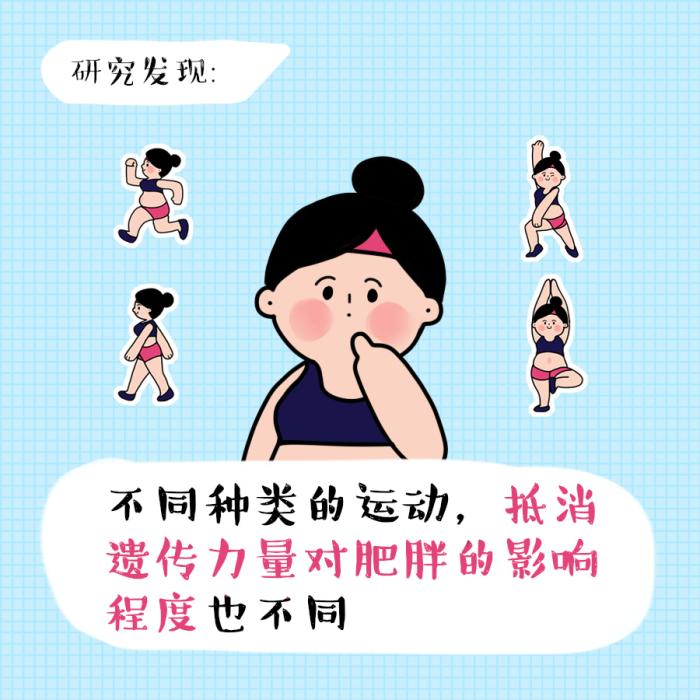 大多数“易胖体质”的人,其基因倾向于囤积脂肪。有国外研究发现:“不同种类的运动,抵消遗传力量对肥胖的影响程度也不同。”具体来说,研究发现包括骑自行车、伸展运动、游泳等的项目都“似乎无法抵消遗传偏见”。