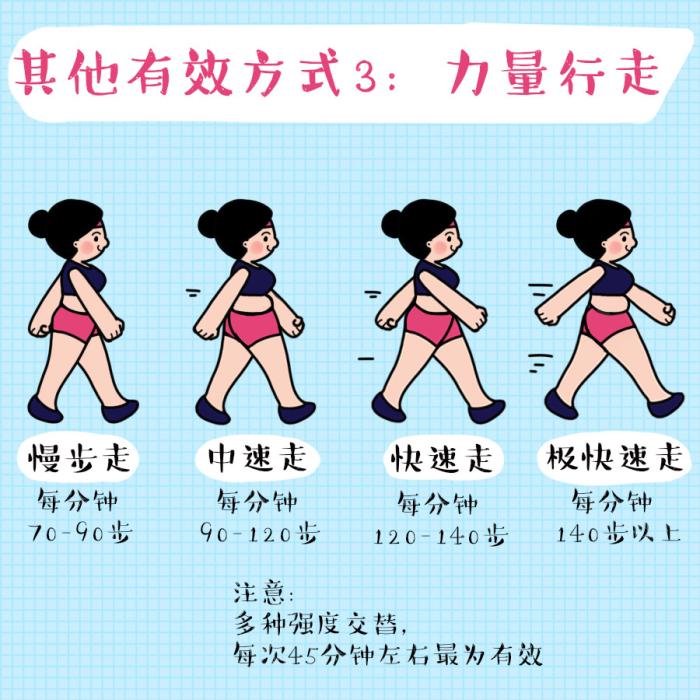 力量行走与健步走类似,但强度因人而异。通常可以分为慢步走(每分钟约70-90步)、中速走(每分钟90-120步)、快步走(每分钟120-140步)、极快速走(每分钟140步以上)。每次45分钟左右,多种强度交替进行是最有效的行走方法。