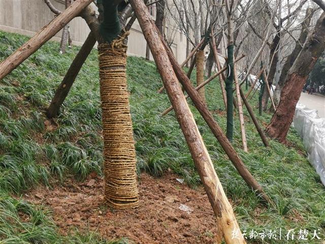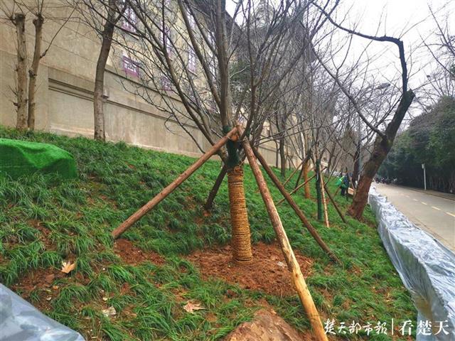 今天下午,寒风下依然有不少游人慕名参观武大老斋舍。老斋舍和樱花大道之间的土坡上可以看到,有不少新栽的樱花树用木头加固着,老树上多个部位也涂上了保护涂料,原本外露的黄土已经变成草坪,外围新增的绿篱上还盖着保温塑料布。