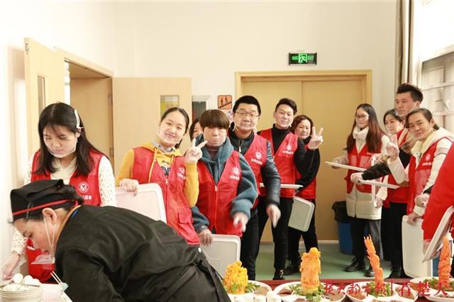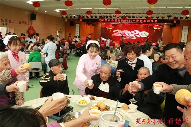 汉阳区社会福利院为老人和孩子们准备了丰富的团年宴,来自汉阳清露、汉阳树下、春晓、牧笛、零距离、童创、博雅、莘升、泓奕、乐帮、知音、万波、颐心、心劢、孵化基地等公益机构的40余名志愿者,将这些香喷喷的饭菜端到老人面前,与老人一起团年。“祝您们新年快乐,万寿无疆!”“爷爷奶奶们春节快乐,祝您们永远幸福安康!”年轻的志愿者们纷纷走到老人们面前,为他们送上新春祝福。吃上香喷喷的饭菜,收到情真意切的祝福,老人们个个高兴不已。74岁的王爹爹感叹说:“生活在这里,福利院无微不至的服务,让我每天感受到家的温暖;常年还有来自社会各界的关爱和慰问,感觉特别幸福;春节到了,我在这里并不孤单!”