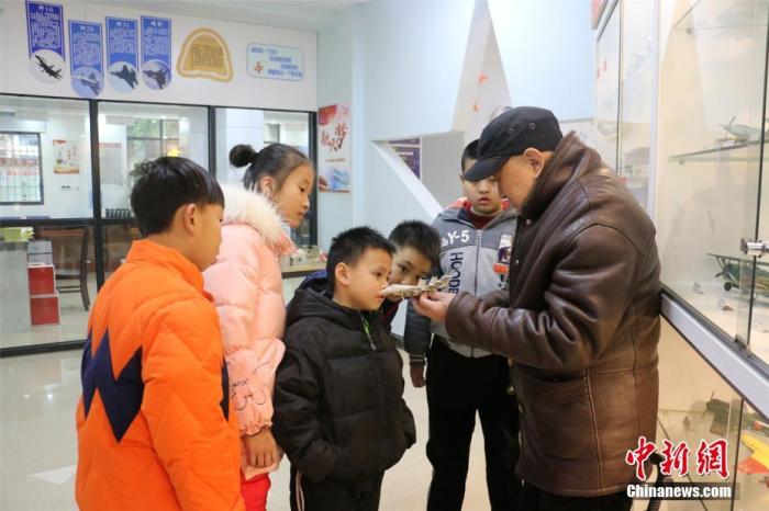 杨腾祥给孩子们展示其制作的飞机模型。 林馨 摄