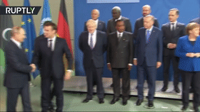“今日俄罗斯”发布的视频显示,利比亚问题国际会议合影环节,由于不见普京的身影,德国总理默克尔显得特别不安,多次转身寻找普京的身影,并用手指向他应站立的位置。站在默克尔身旁的法国总统马克龙随后也开始左右环顾,寻找普京。