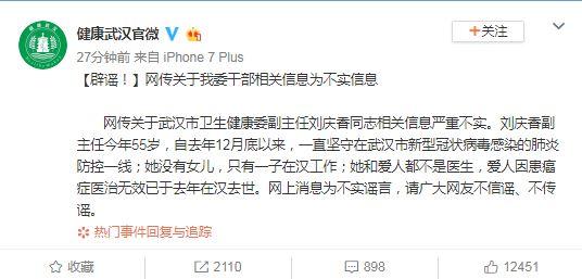 中新网1月22日电 武汉市卫健委今日在官方微博辟谣称,网传关于武汉市卫生健康委副主任刘庆香同志相关信息严重不实。刘庆香副主任今年55岁,自去年12月底以来,一直坚守在武汉市新型冠状病毒感染的肺炎防控一线。