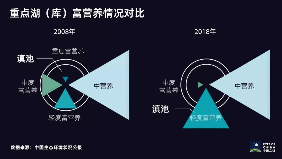 在富营养监测中,随着滇池水环境的改善,重度富营养情况消失,中度富营养情况也明显减少。