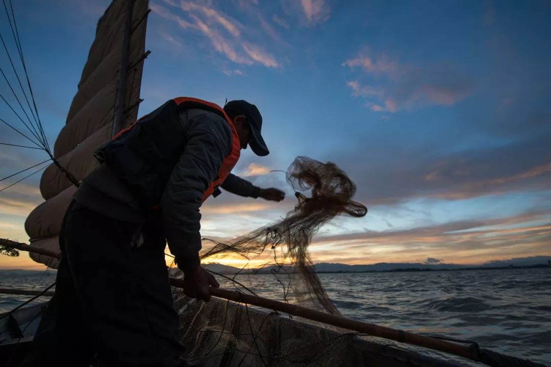渔民李培光从渔船上抛下渔网(2019年10月22日摄)。由于环境改善,一条船一个开湖季就有3万多元收入。当地渔民也早已不再使用燃油机动船出湖捕鱼,取而代之的是一种传统的三桅帆船。新华社记者 胡超 摄