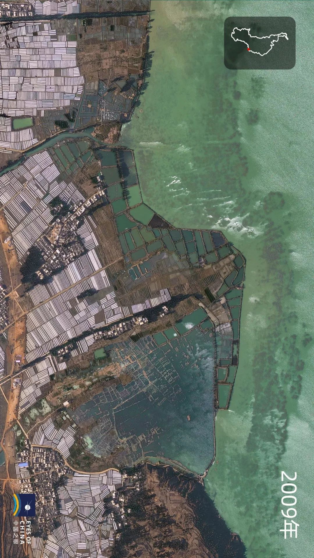 2009年、2019年,滇池东南部区域卫星对比图。银灰色的蔬菜大棚、连片的鱼塘被拆除,取而代之的是古滇湿地公园宁静的湖面。湖进人退,滇池摆脱水污染“绝症晚期”,恢复生机。