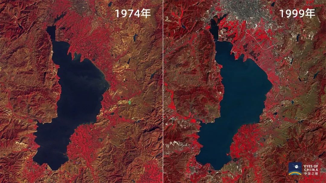 1974年、1999年环滇池区域卫星对比图,多光谱分析可见,浅色的城区明显向滇池延伸。