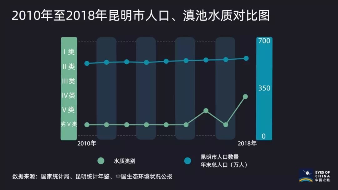 2010年至2018年间,昆明市人口增长35.36万人,滇池水质从劣V类回归Ⅳ类。
