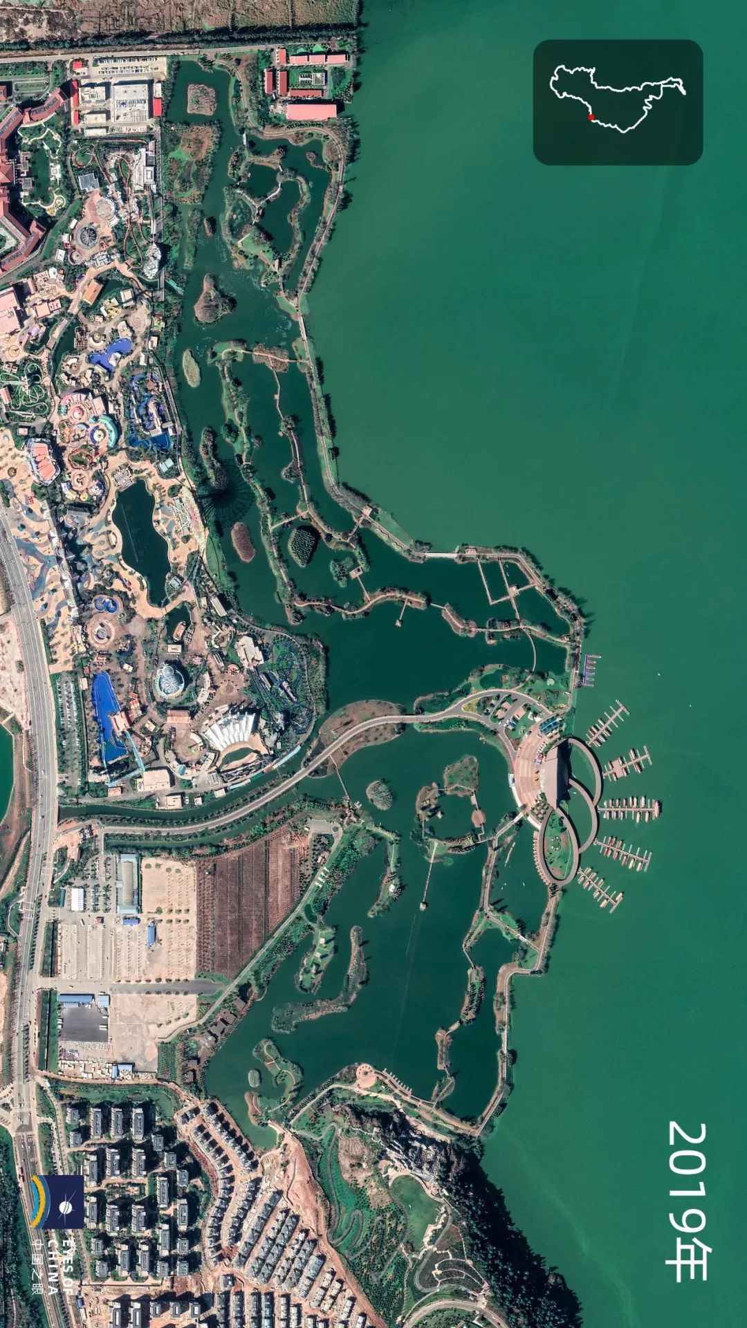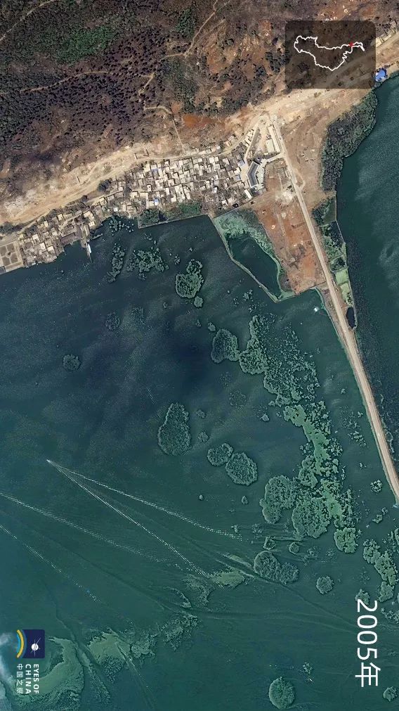 位于草海与外海交汇处的龙门湿地公园,改造前后卫星图对比。