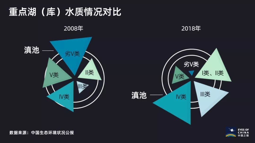 滇池治理,是十八大以来“美丽中国”建设的缩影。从2008年到2018年,23个包括滇池在内的重点湖(库)环境问题得到极大改善:劣Ⅴ类数量大大减少,Ⅰ、Ⅱ、Ⅲ类占比超过半数。