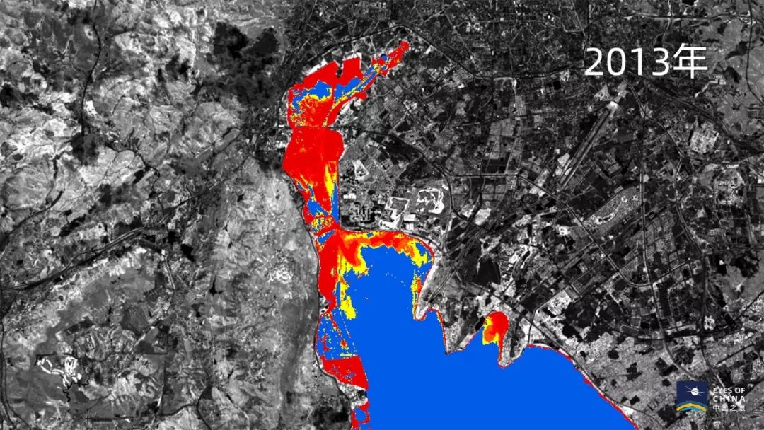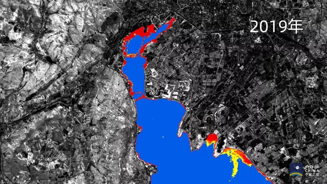 每年5月是滇池水华开始爆发的时间。通过卫星多光谱数据可见,2013年5月、2017年5月、2019年5月,污染最严重的滇池北侧湖面,疑似为水华区域的红、橙、黄色区域明显缩减。