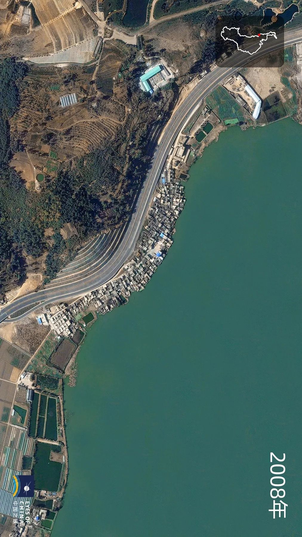 此次习近平总书记到访的星海半岛滨湖生态湿地,位于盘龙江注入滇池的入湖口,规划面积上千亩,4年前开工建设。在环绕滇池的诸多湿地公园中,这个公园不大但却精致,芦苇、菖蒲丛生,栈道蜿蜒,水波清透。这里曾有3个湖边村庄。从2008年和2019年的卫星图对比可见,紧贴湖水的大棚和农田已变为公园绿地。